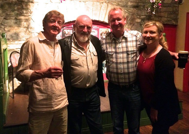 Chieftains Kevin Conneff, Matt Molloy, Jeff, Laura at Molloy’s Pub in Westport, Ireland.